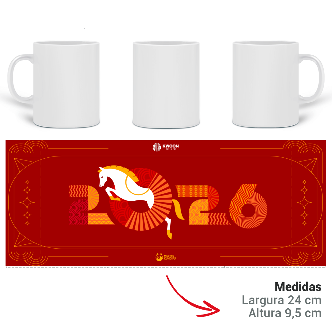 A Caneca Ano Novo Chinês 2026 – Cavalo em Movimento celebra a virada do ano com uma arte intensa e cheia de energia. O cavalo aparece em ação no centro da composição, simbolizando avanço, força e continuidade, valores muito presentes na filosofia das artes marciais.
