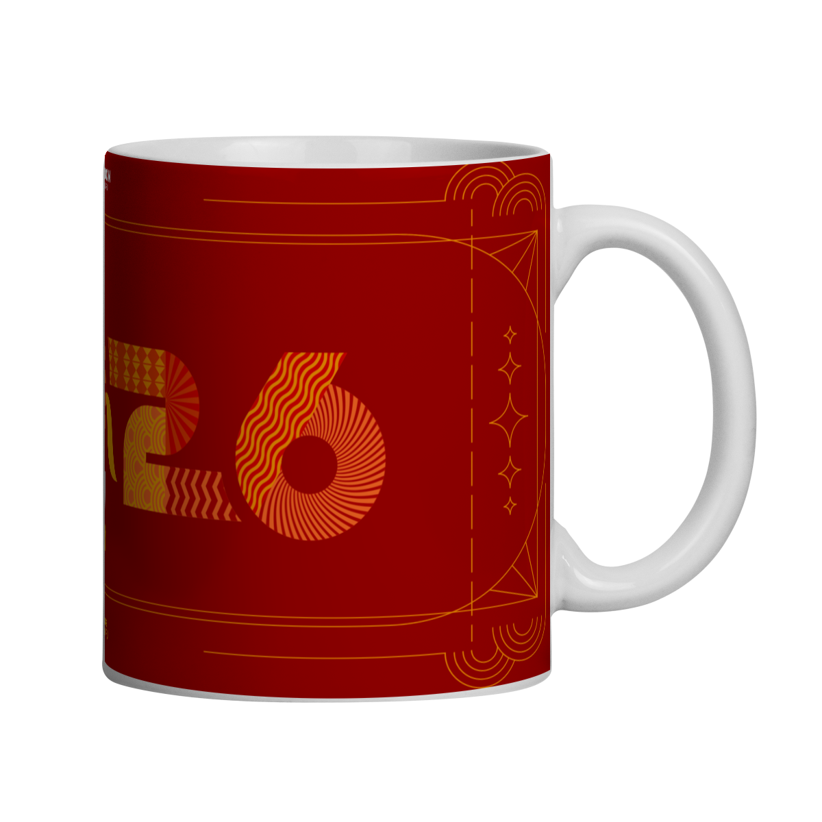 O fundo vermelho reforça a conexão com o Ano Novo Chinês, enquanto os detalhes gráficos em tons de dourado e laranja criam profundidade e ritmo visual. O número 2026 se integra à arte de forma orgânica, transformando a data em parte do desenho e não apenas em um elemento informativo.