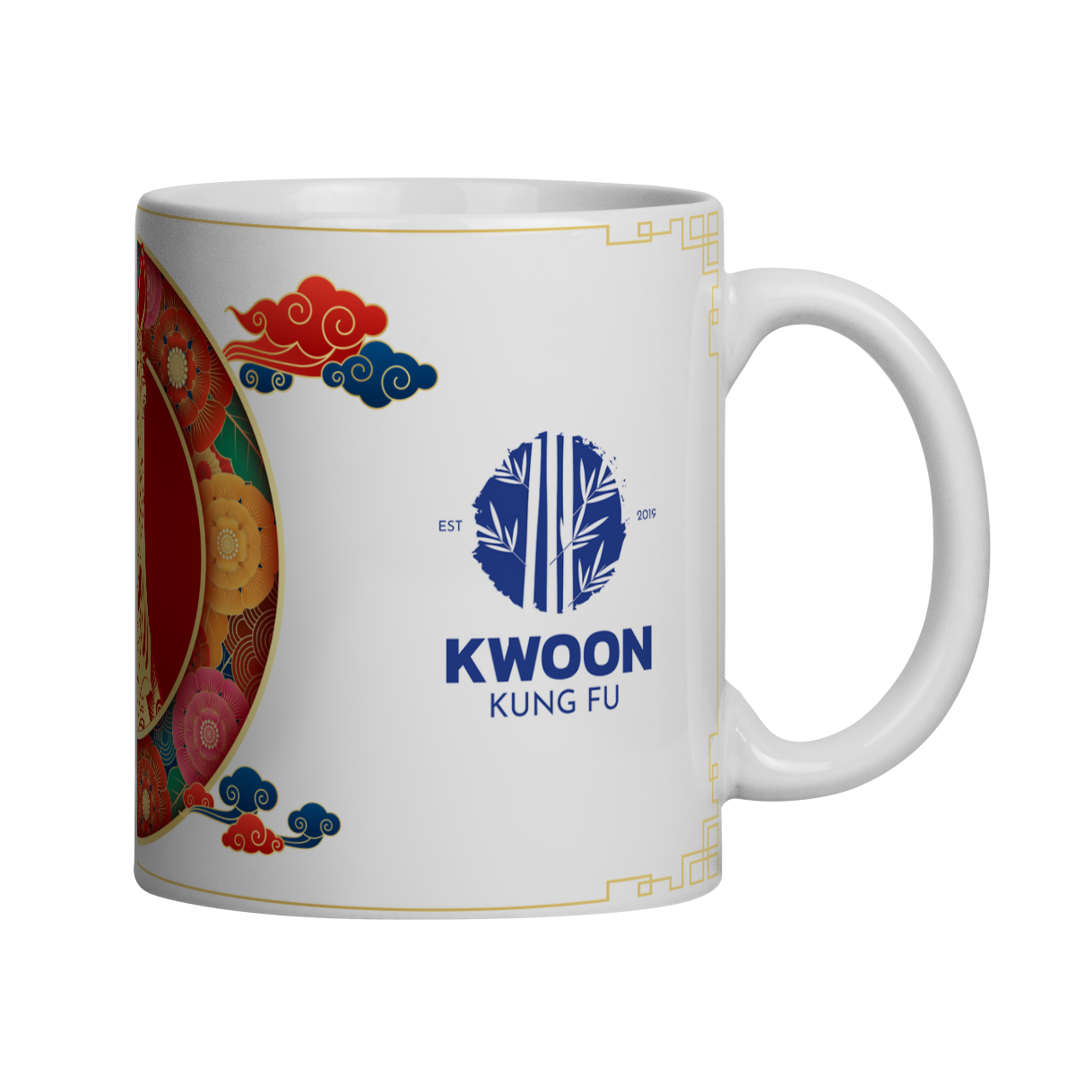 O fundo branco valoriza os detalhes da arte, enquanto o círculo ornamental reúne flores, nuvens e padrões orientais em tons de vermelho, dourado, azul e verde. O resultado é uma caneca visualmente marcante, mas ao mesmo tempo leve e fácil de usar no dia a dia.