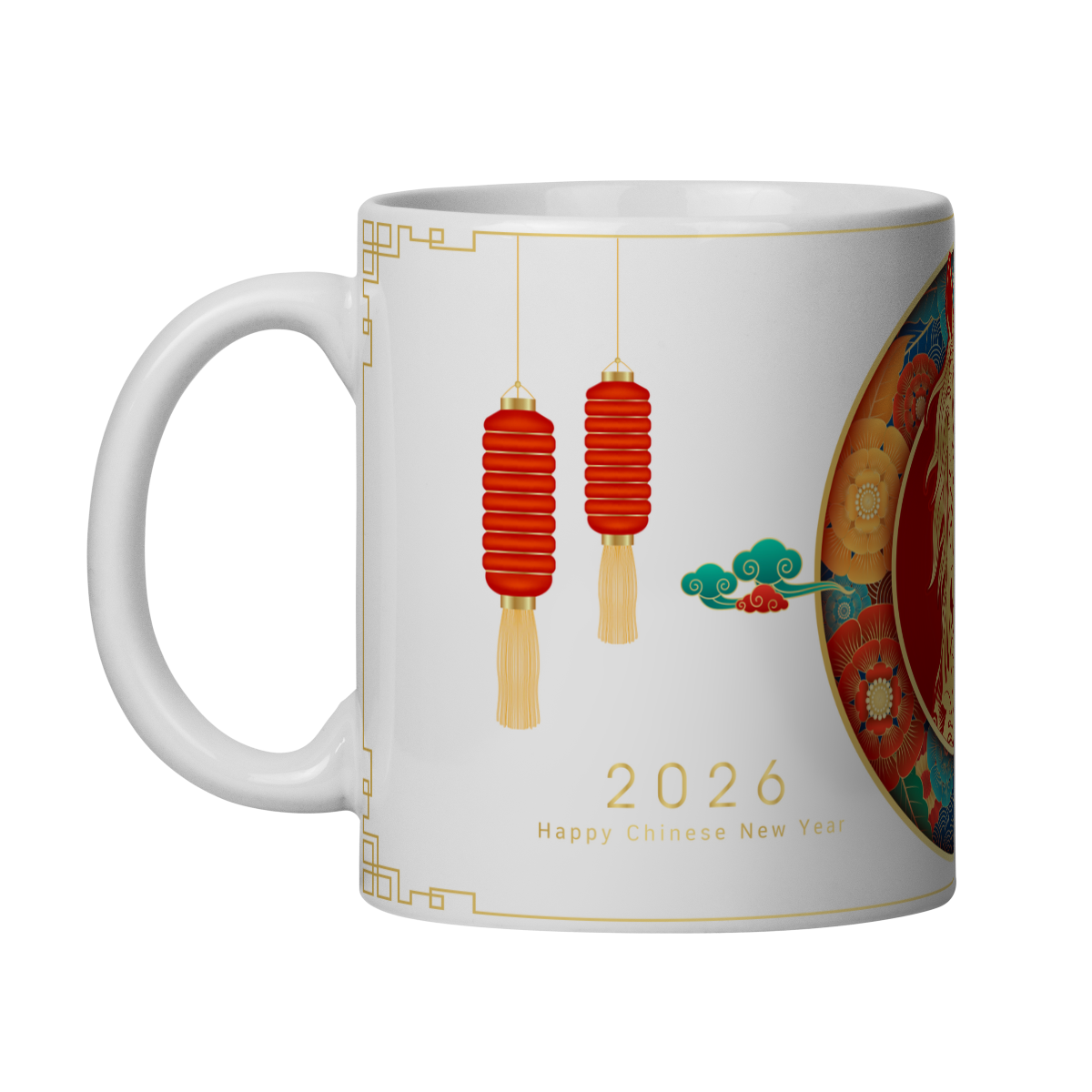 A Caneca Ano Novo Chinês 2026 – Cavalo Floral celebra o Ano do Cavalo com uma arte rica em cores, símbolos e equilíbrio visual. A ilustração traz a cabeça do cavalo em destaque, representando força, foco e movimento, cercada por elementos tradicionais da cultura chinesa em uma composição vibrante e elegante.
